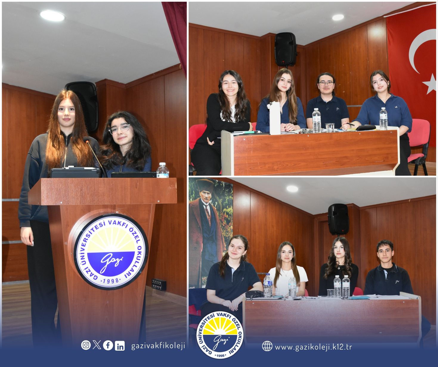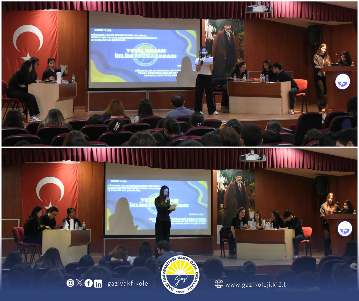 "Küresel iklim meseleleri, bilinçli bireyler ve onların kendi aralarındaki iş birliği ile çözülür." görüşüne karşı "Küresel iklim meseleleri bireyle değil; yasal zorunluluklar ve devletlerin kendi iç politikalarıyla çözülür." görüşünü tartıştıkları münazara etkinliği düzenlediler. Özgün fikirler üretebilmeleri, karşılaştıkları problemlere bireysel ya da iş birliği içinde çözüm önerileri geliştirebilmeleri, farklı görüşleri bilimsel ve istatistikî verilerle savunabilmeleri, mantık yürütme, tez ve antitez oluşturma becerilerini güçlendirmelerine hizmet eden bu etkinlikte emeği geçen öğrencilerimizi kutluyoruz.